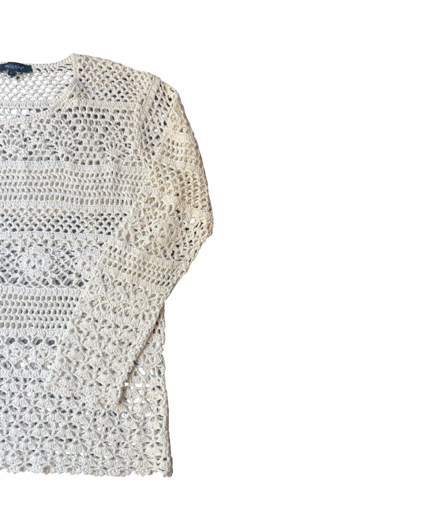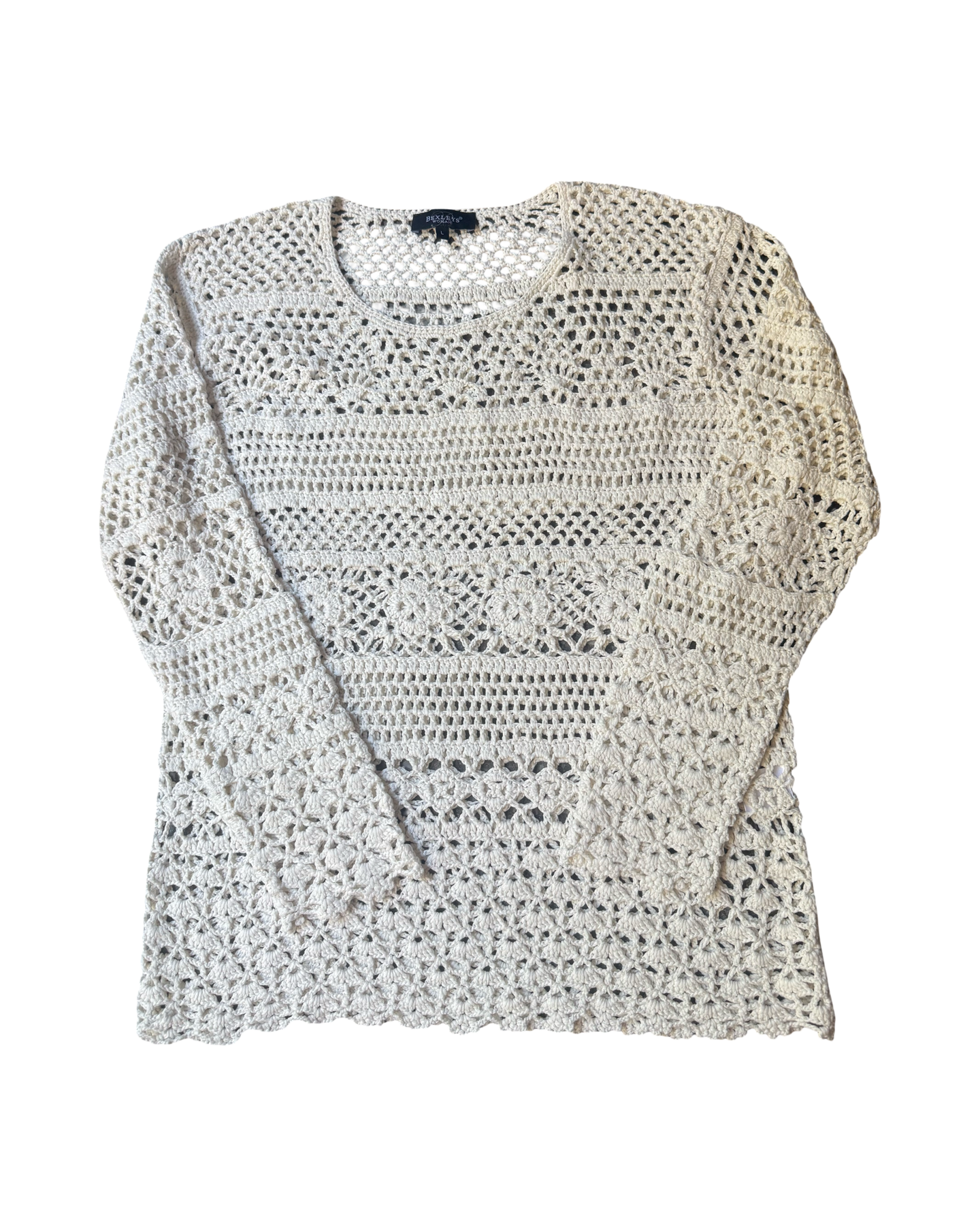 This vintage Y2K crochet knit jumper is designed as a fitted to oversized fit, featuring round neck, scalloped pattern throughout. Pair this with your favorite jeans for a super casual relaxed look.